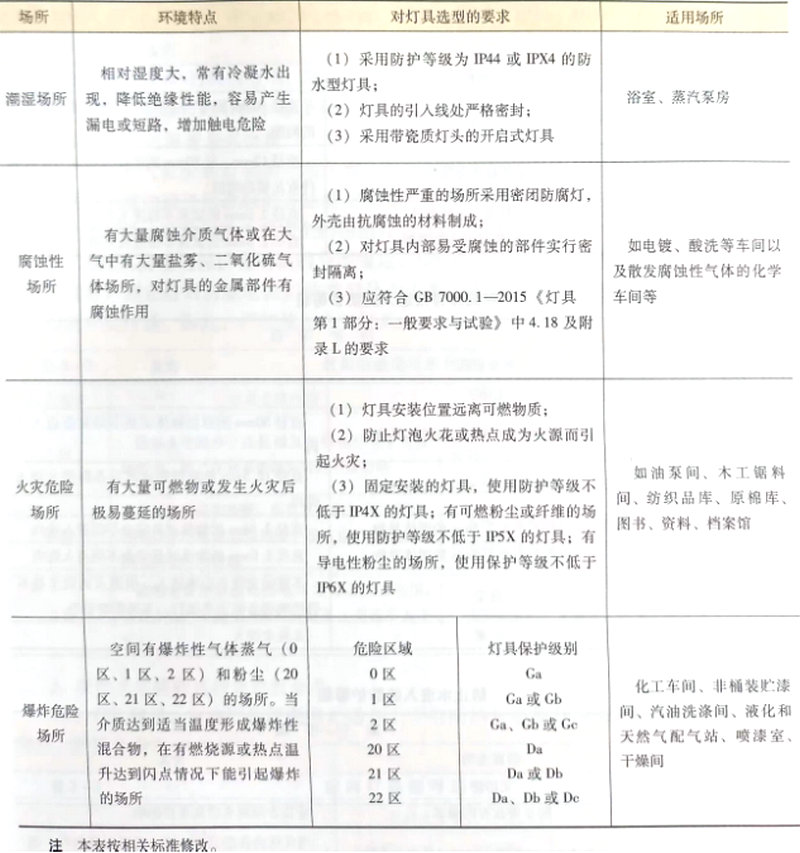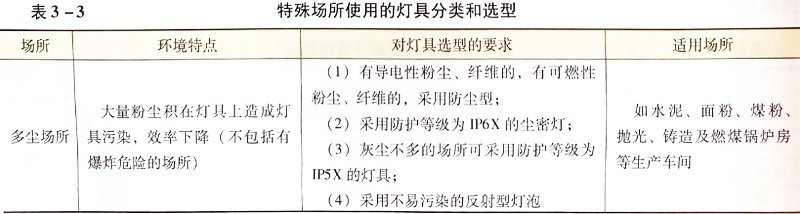 四、按照特殊場所使用環境分類 燈具根據其特殊場所使用環境,可以分為多塵、潮濕、腐蝕、火災危險和有爆炸危險的場所使用的燈具,其分類和選型見表3-3